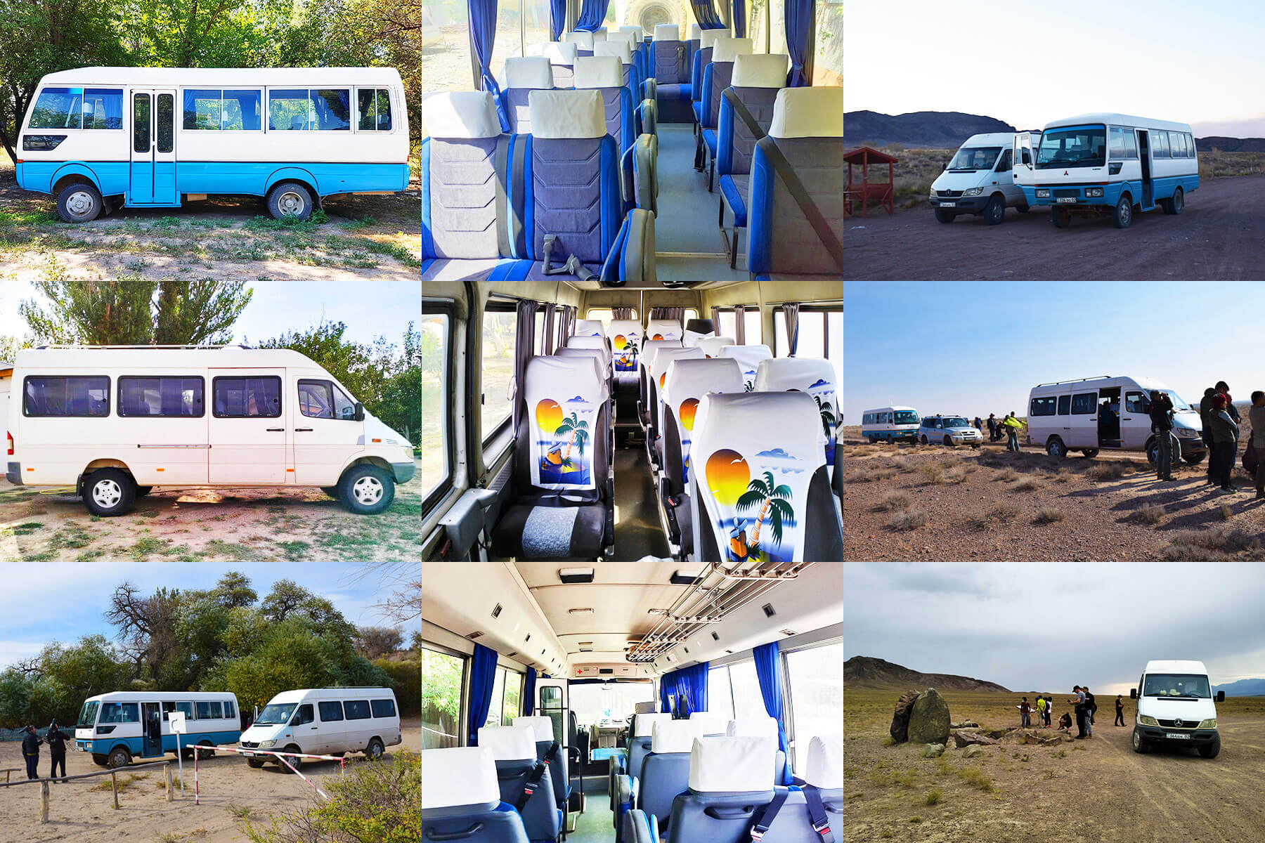 Аренда внедорожных автобусов в селе Басши для групповых туров на Поющий бархан и в горы Актау.